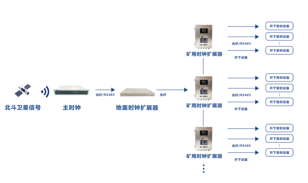 地面时钟设备捕获北斗卫星时间信号后,经IRIG-B码编码形成标准时间源,为井下无卫星信号区域提供可靠时间基准支撑。