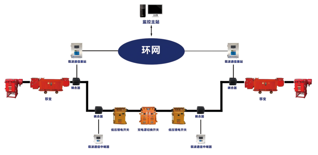 低频电磁耦合式通信装置以电缆金属铠装层/屏蔽层为传输介质,无需单独铺设通信线缆,通过电磁感应耦合实现无接触信号传递。信号经发射端—耦合器—电缆屏蔽层—耦合器—接收端形成闭环,适用于高电磁干扰、小数据量传输场景,可对矿山主干网络进行有效补盲。