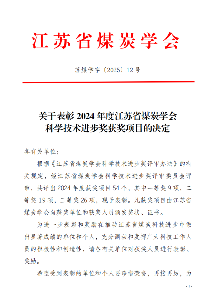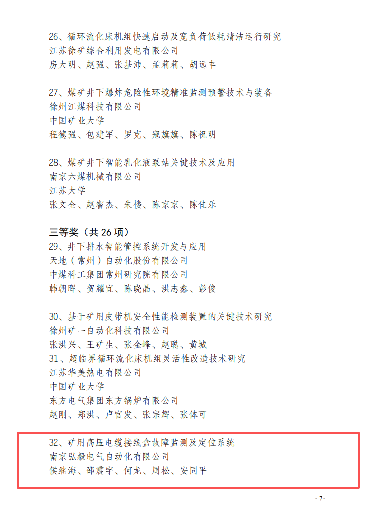 近日,江苏省煤炭学会正式印发《关于表彰2024年度江苏省煤炭学会科学技术进步奖获奖项目的决定》(苏煤学字〔2025〕12号),南京弘毅电气自动化有限公司凭借“矿用高压电缆接线盒故障监测及定位系统”项目,成功斩获2024年度江苏省煤炭学会科学技术进步奖三等奖!这一荣誉不仅是省级行业权威机构对公司技术创新成果的高度认可,更是对公司深耕矿山安全自动化领域实力的有力佐证。
