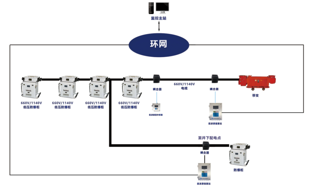 低频电磁耦合式通信装置以电缆金属铠装层/屏蔽层为传输介质,无需单独铺设通信线缆,通过电磁感应耦合实现无接触信号传递。信号经发射端—耦合器—电缆屏蔽层—耦合器—接收端形成闭环,适用于高电磁干扰、小数据量传输场景,可对矿山主干网络进行有效补盲。